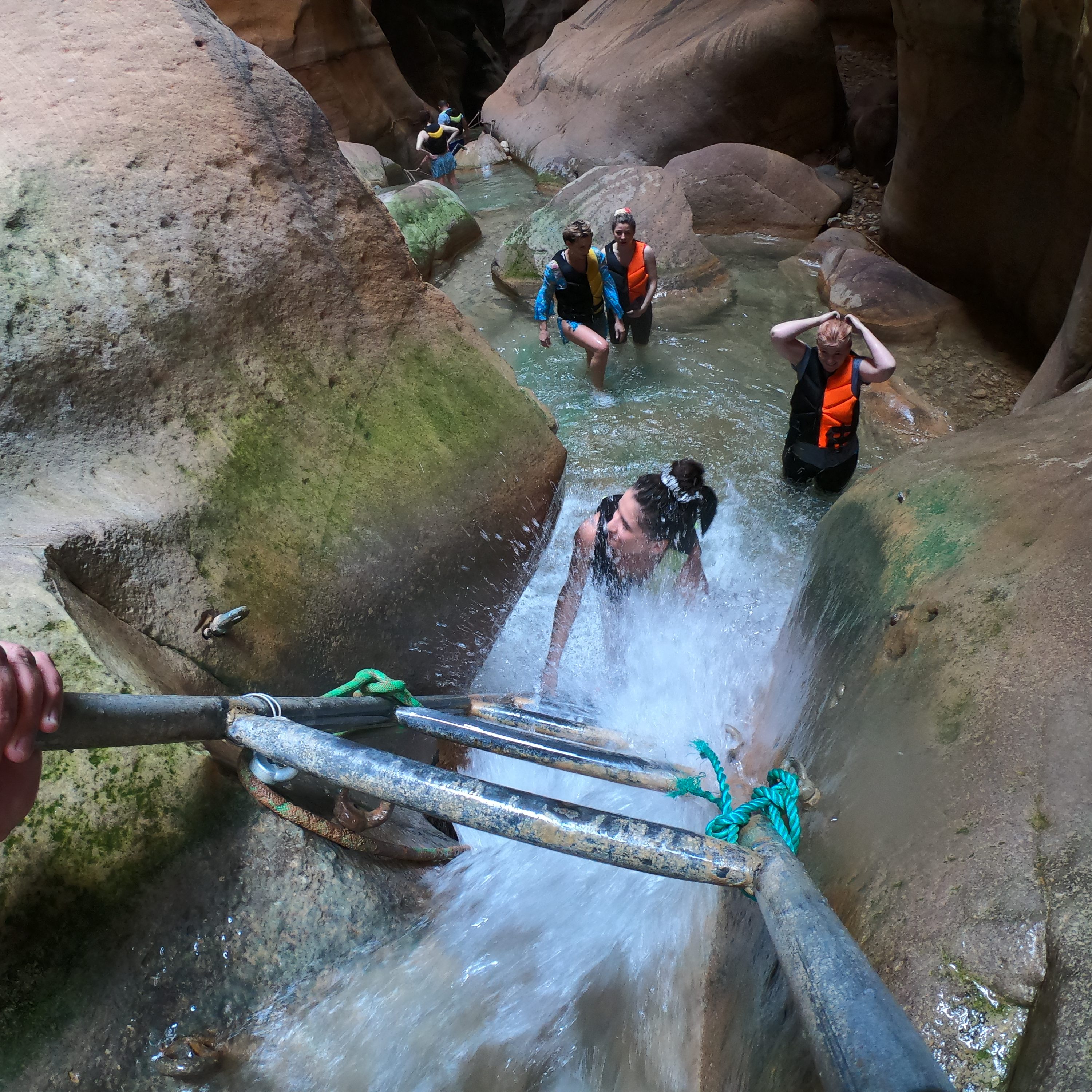 Drumul continua in aceeași geografie. Alternează porțiuni cu apa pina la gât, cu cascade pe care trebuie sa le treci, ajutata de scări, frânghii.